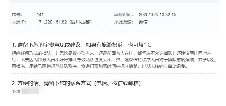 “拒绝任何形式的插队!”10月5日上午,一条通过“吐槽码”提交的建议引起了四川省剑阁县文旅部门的重视。接到反馈后,该部门立即增派工作人员加强现场秩序维护,并在游客排队区域安排文艺演出,有效改善了游客的旅游体验。